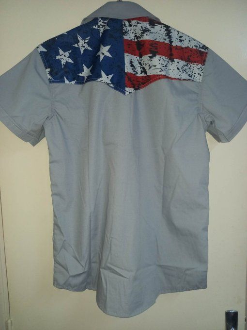 Chemise de couleur grise avec plastron recto & verso d ' un impression d'un drapeau américain, 2 poches sur le devant, boutons pressions et manche assez courte. ( existe ce modèle en femme)