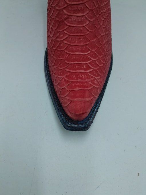 Botte en cuir de couleur rouge avec ces 2 étoiles en métal sur les oreilles ainsi que sa couture fantaisie sur toute la tige et pour finir avec une imitation de python sur le coup de pied et l'arrière, bout demi pointu et talon légèrement biseauté.