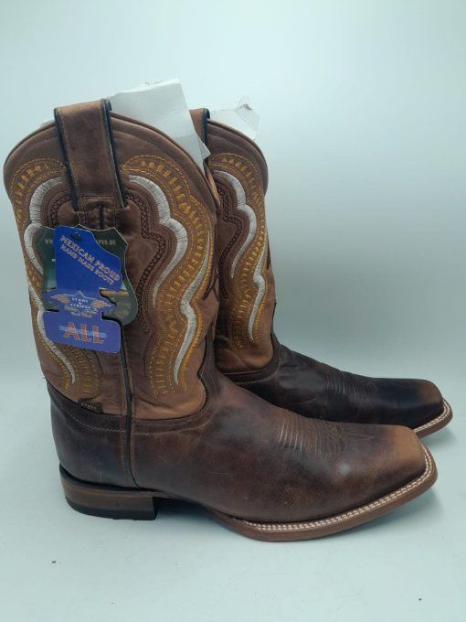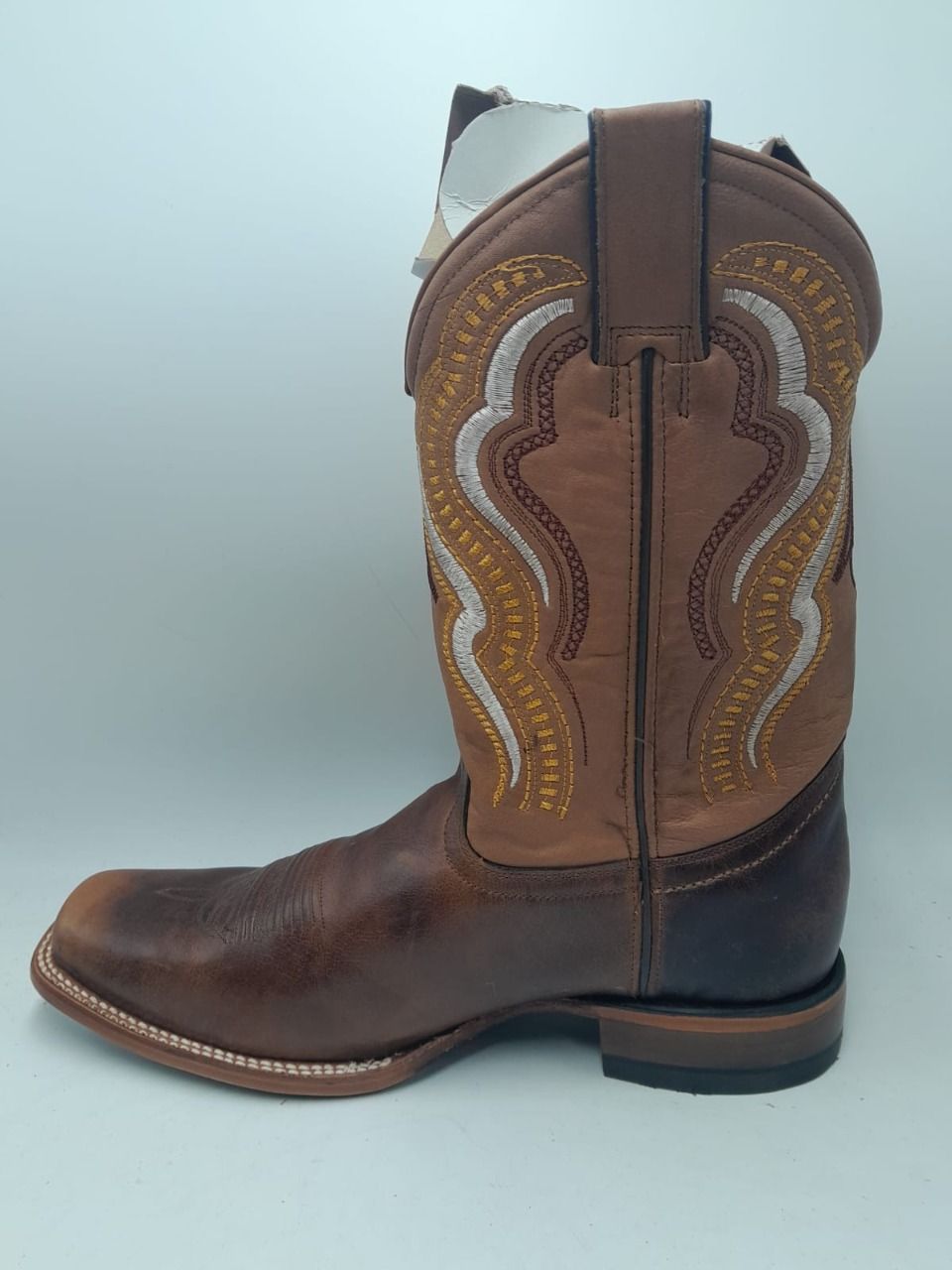 Botte en cuir de couleur marron clair sur la tige et marron foncé sur le coup de pied, surpiqûres bicolores, bout carré et talon normale (3.5 cm)