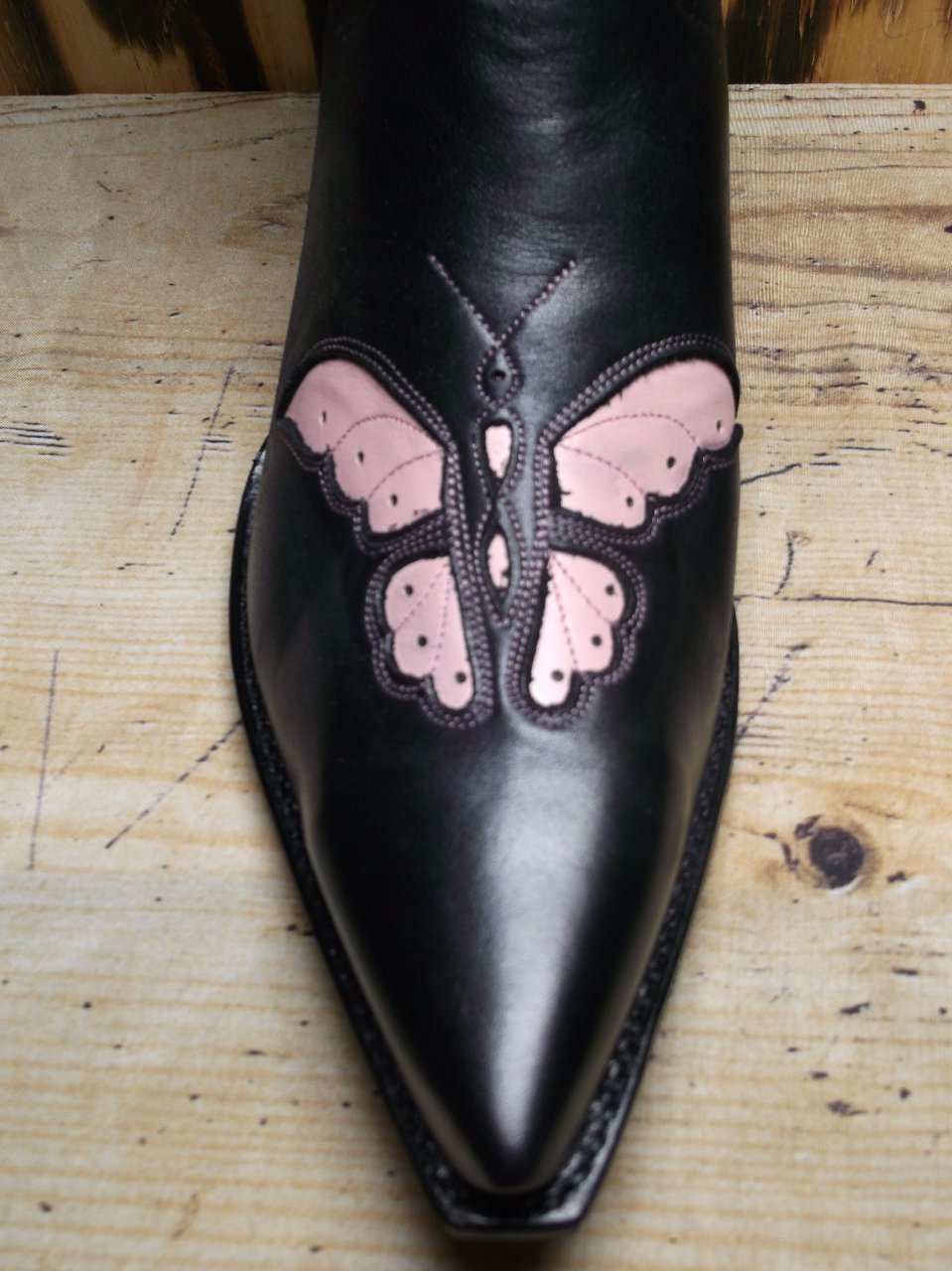 "Botte papillon rose " : Bottes fantaisie noir, avec papillon sur le dessus rose et dessin papillon rose sur la tige .