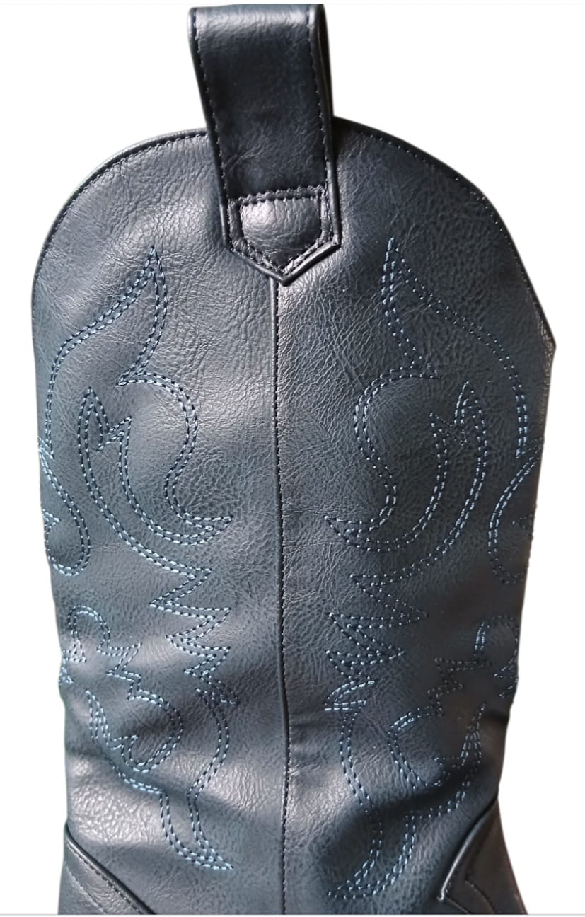 Botte en synthétique de couleur bleu foncé (blue), semelle en caoutchouc, tige mi- mollet, bout demi - pointue et talon normale (4cm) facile à enfiler..