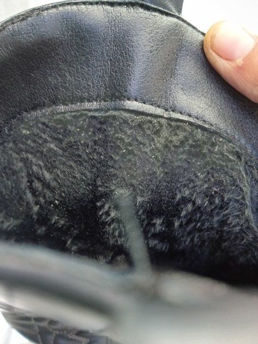 Botte en synthétique de couleur noir avec broderies de couleur beige avec fermeture éclair sur le côté de la botte , doublure mal classé, bout demie - pointue, et talon légèrement biseauté. (Dimension de la hauteur du talon est de 5 cm.)