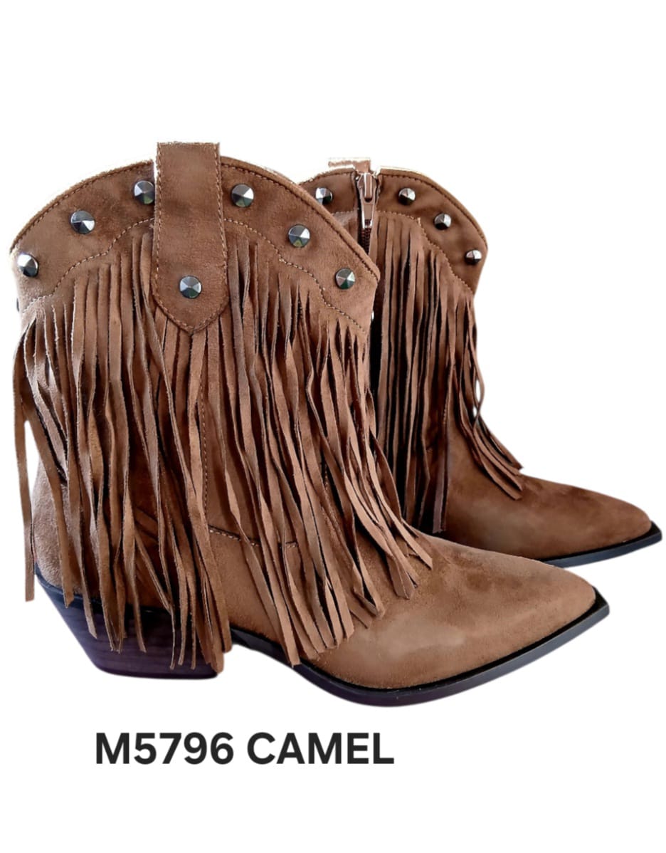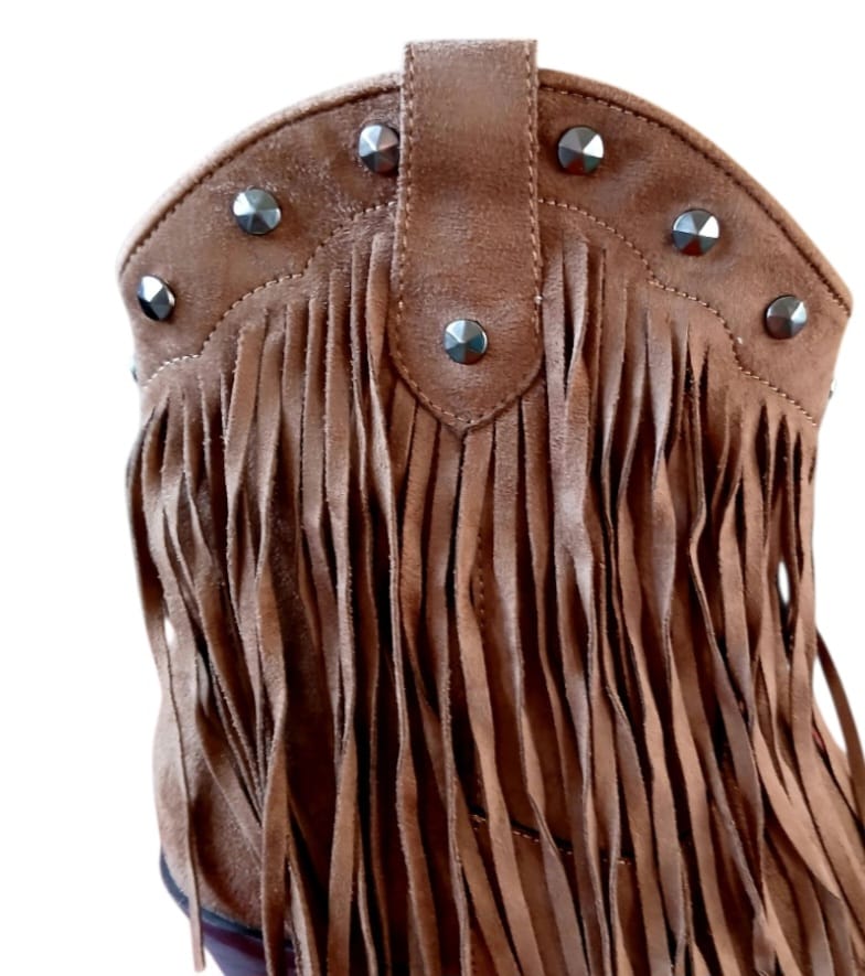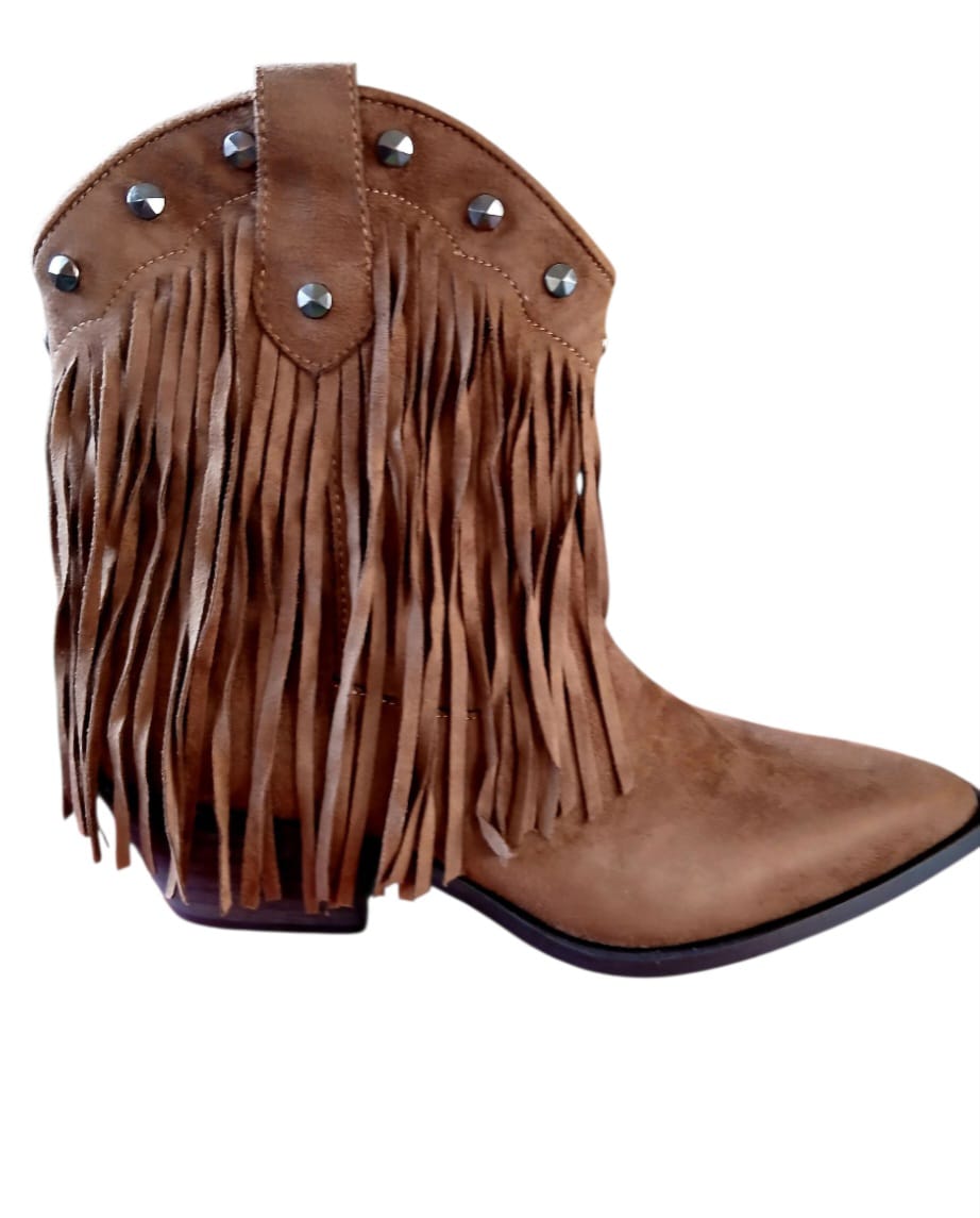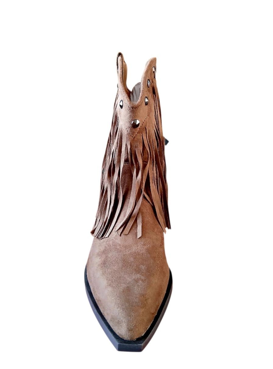 Bottine basse à franges de couleur marron caramel (camel) façon daim et synthétique classique avec fermeture éclair sur le côté, cloutés en haut de la bottine, bout pointue et talon légèrement biseauté (4.5 cm)