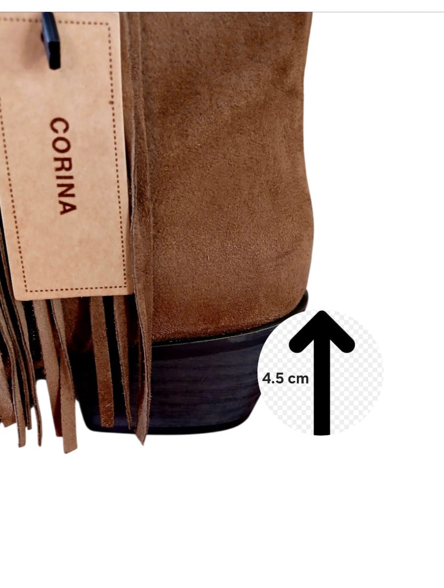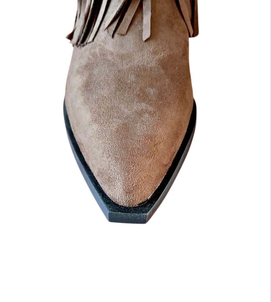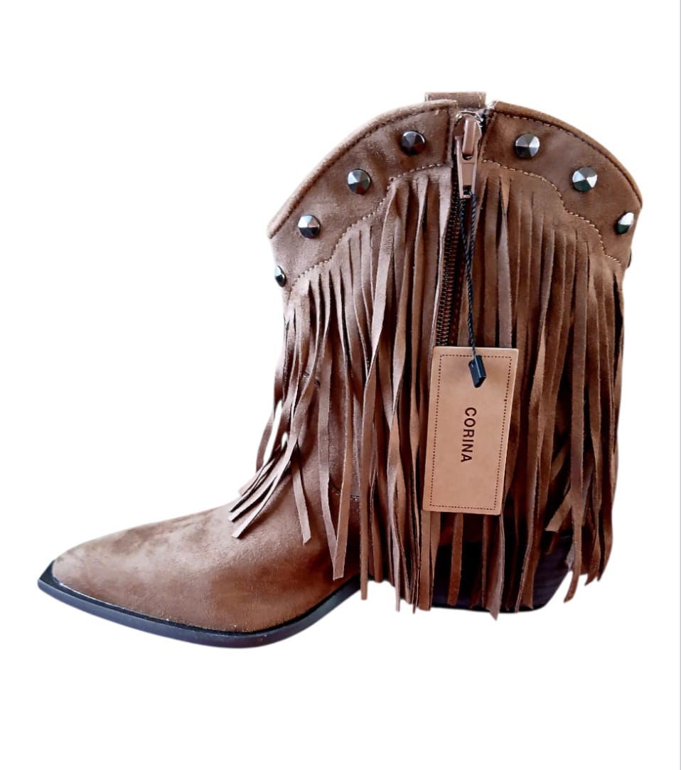 Bottine basse à franges de couleur marron caramel (camel) façon daim et synthétique classique avec fermeture éclair sur le côté, cloutés en haut de la bottine, bout pointue et talon légèrement biseauté (4.5 cm)