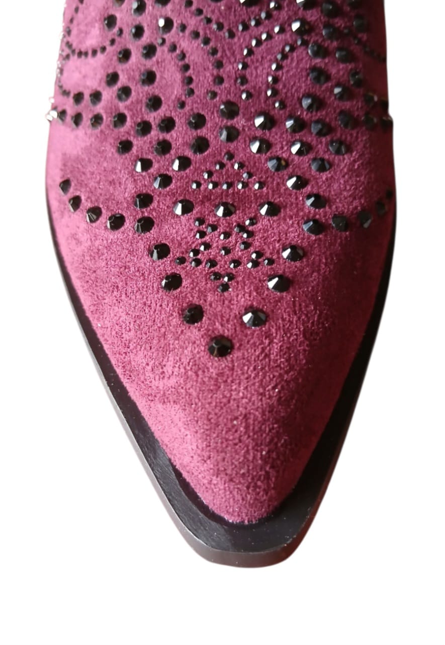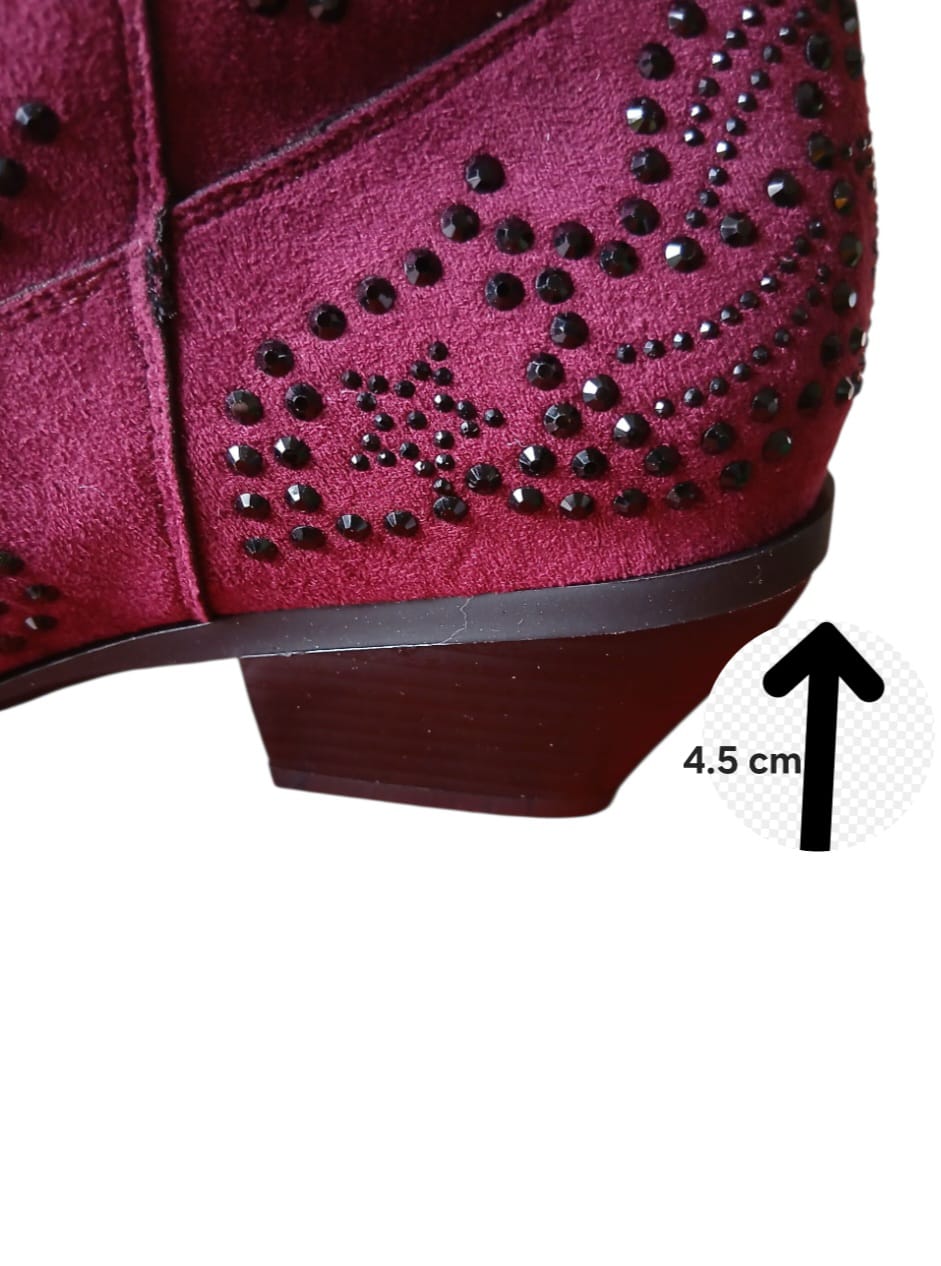 Bottine basse de couleur rouge bordeaux foncé façon daim et synthétique avec surpiqûres de strass noir sur l'ensemble de la bottine, bout pointue et talon légèrement biseauté (5 cm).