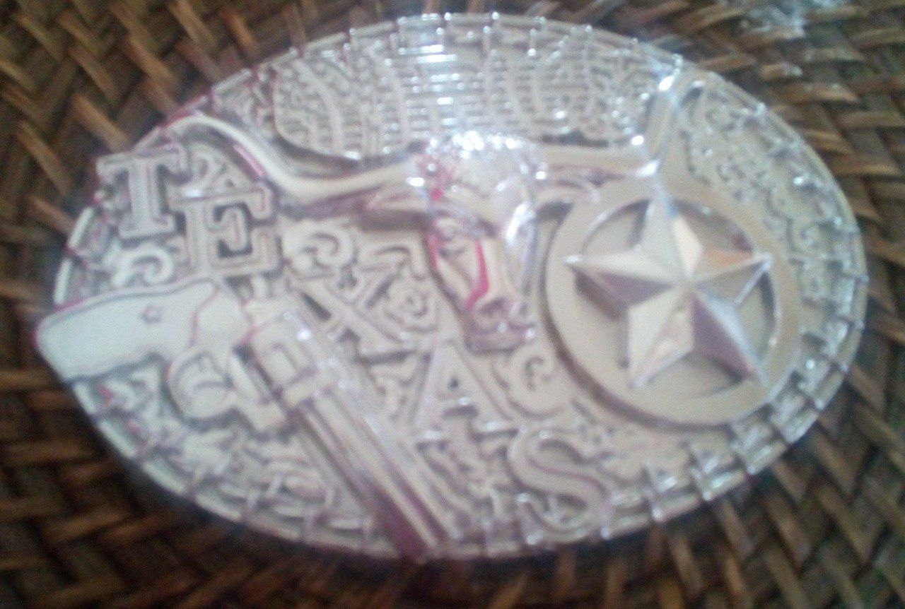 Boucle de ceinture en métal blanc dessin pistolet, etoile de sheriff et le centrale le buffle Texas.