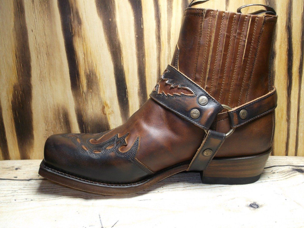 Bottine tout cuir avec élastique pour la facilité de l'enfiler, couleur bicolore, sangle de botte intégré et bout carré.