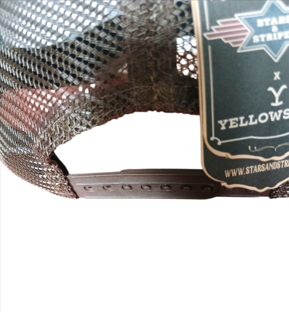 Casquette Yellowstone mixte en tissus de couleur marron foncé, patch discret avec écrits orange : " YELLOWSTONE Dutton Y Ranch ", taille réglable fermeture snapback ajourée à l'arrière de la tête (voir 3 e photos) et bande anti -transpiration en coton.