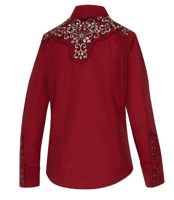 Chemise manches longues de couleur rouge foncé, broderies florales : la poitrine, le dos, de couleur blanc/noir ainsi que ces boutons pressions & liseré fin de couleur bicolore. Assortie à la chemise homme "MASON"