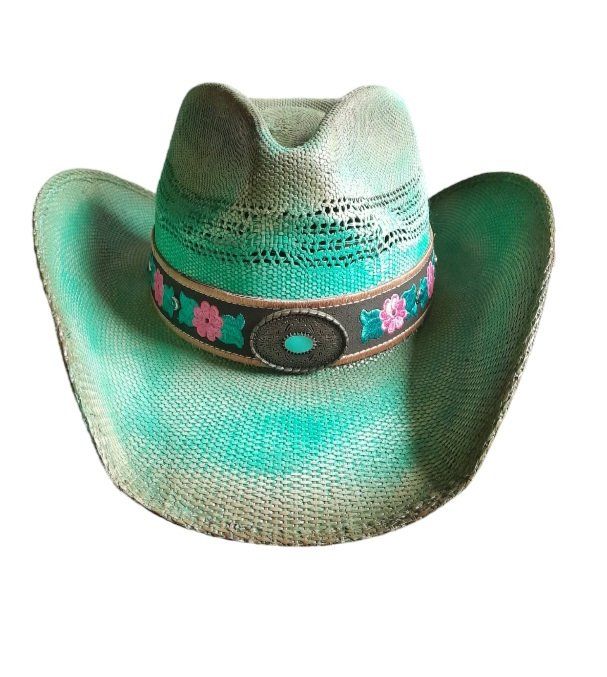 Chapeau en paille laqué de couleur vert pelouse laqué marron ajourée tour de chapeau ainsi que les 2 côtés du chapeau motif florale en couleurs (bleu rose principalement.)