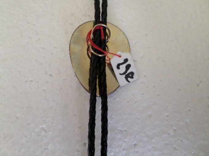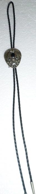 Cravate en cordon tressées noir avec son bolotie ovale (grand modèle) avec motifs incrustés, sa pierre noir reconstitué et son attache coulissante au dos.