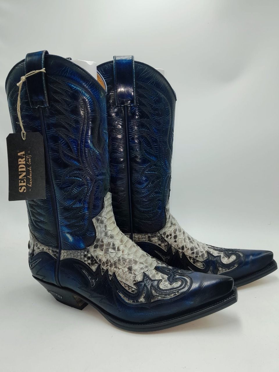 Botte en cuir de couleur bleu roi patiné noir classique avec aigles en surpiqûres discret sur la tige, incrustation de python blanc et noir sur le coup de pied et haut du talon, bout pointue et talon biseauté (3.5 cm)