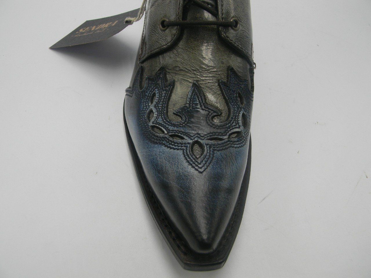 Bottine femme à lacets en cuir glacé de couleur gris passé avec empiècement au coup de pied ainsi qu'a son talon de couleur bleu pétrole, talon légèrement biseauté & bout pointue.