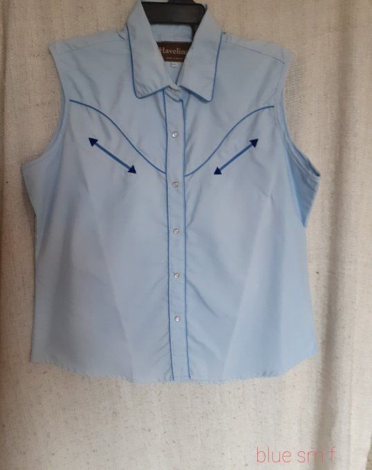 " Blue sans manches " : Chemise sans manche classique de couleur bleu ciel avec liseré bleu foncé, bouton à pressions blanc. Matière : 30% Coton & 70% Polyester.
