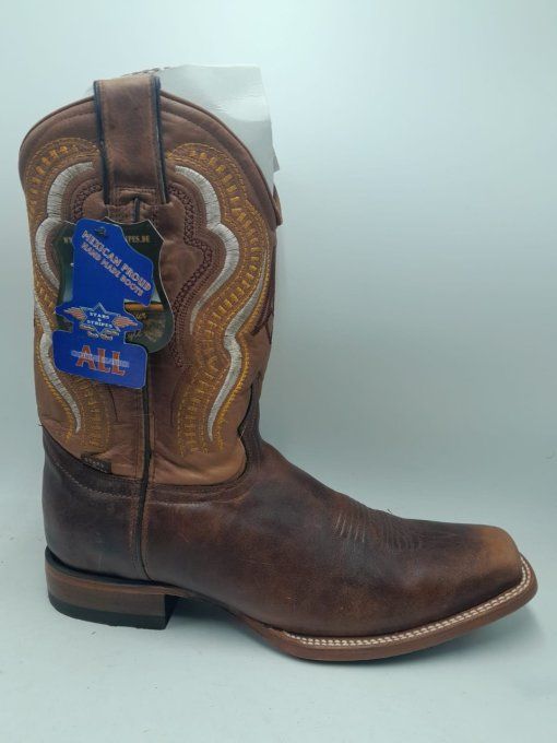 Botte western de couleur marron en cuir avec broderies bicolore sur la tige , doublure et semelle en cuir et bout carré.