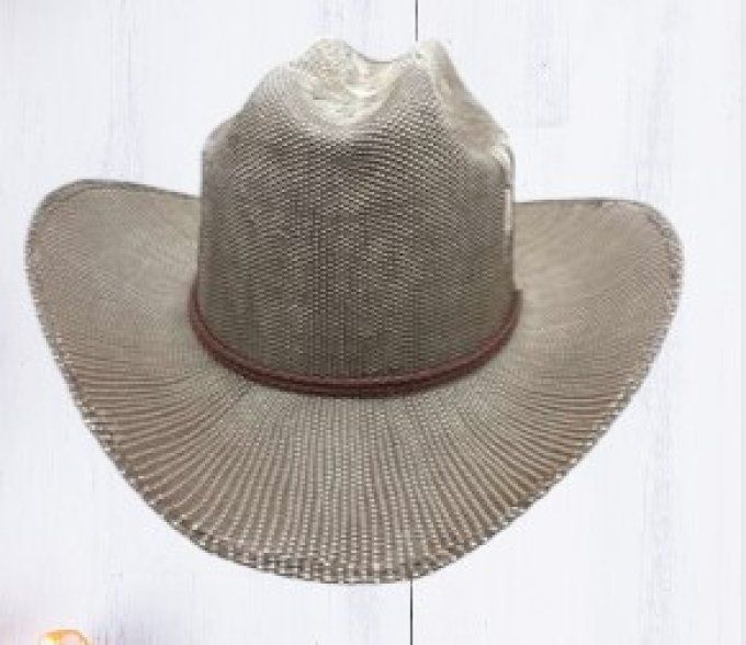 Chapeau en paille enduit de couleur beige ajourée avec son tour de chapeau fin et simple couleur taupe et ces fantaisie en métal. (Tour de chapeau variable suivants les arrivages)