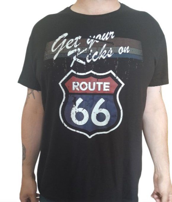Tee-shirt de couleur noir col rond, manches courtes coupe droite avec son imprimée logo route 66 avec son écrit et dessin sur les manches. Matière : Coton (indication de lavage à la 5ème photo du produit)