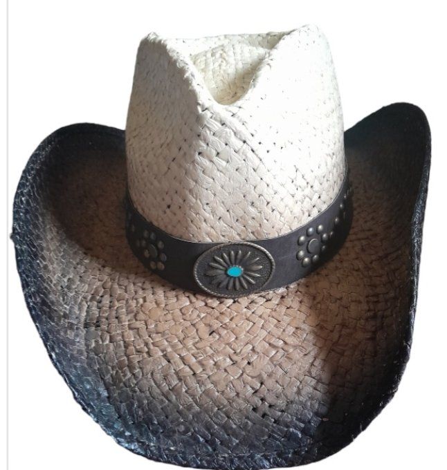 Chapeau en paille laqué de couleurs bicolore ( marrons & beige) ajourée classique avec son tour de chapeau large en cuir foncé et conchas ovale (pastille) pierre bleu.