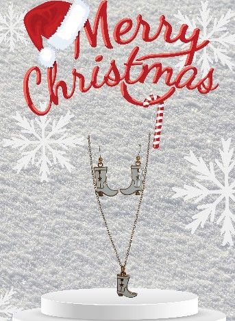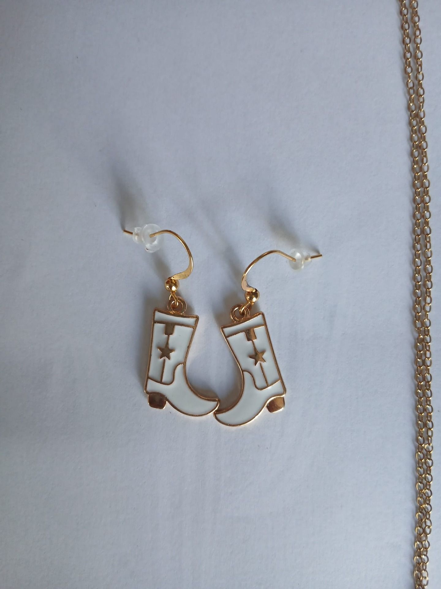 Ensemble collier chaine en acier dorée ainsi que sa paire de boucle d'oreilles botte de couleur blanc avec crochet en acier dorée inoxydable. attache caoutchouc offert avec la paire.