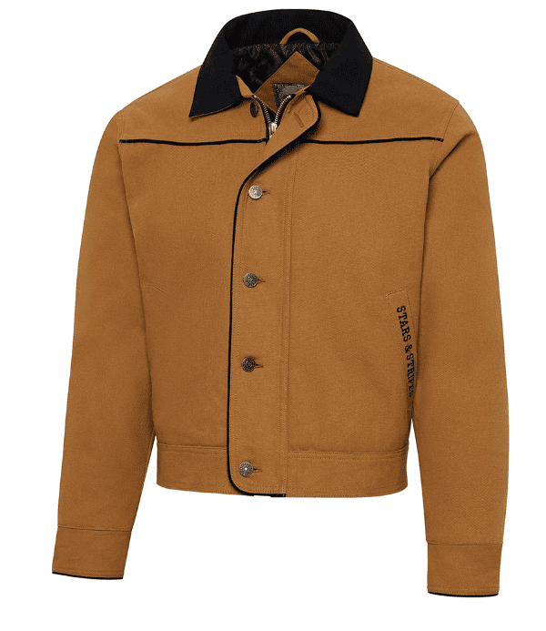 Veste en toile court de couleur marron clair et col marron foncé, doublure rembourrer à carreaux, 2 poches extérieur en biais + 1 poche intérieure, fermeture éclair en métal et boutons.