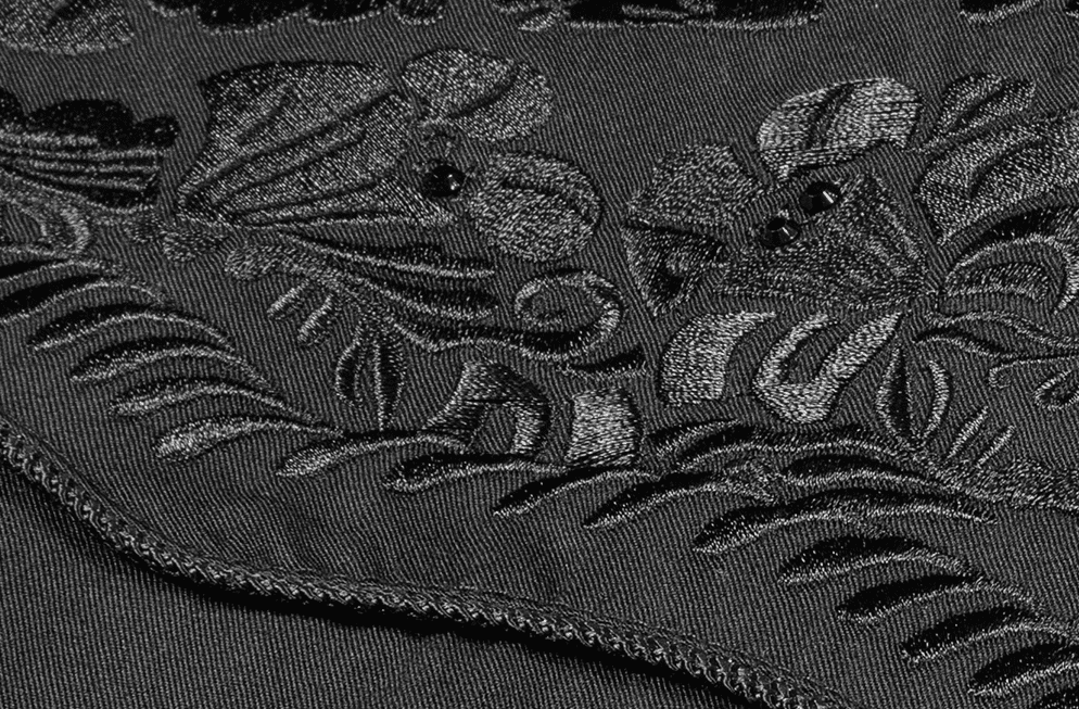 Chemise manche longue de couleur noir simple avec pierres en strass et broderies florales sur la poitrine et dos ainsi que les manchettes, fausses poches et boutons à pressions noir. Assortie chemise homme " BRODY "