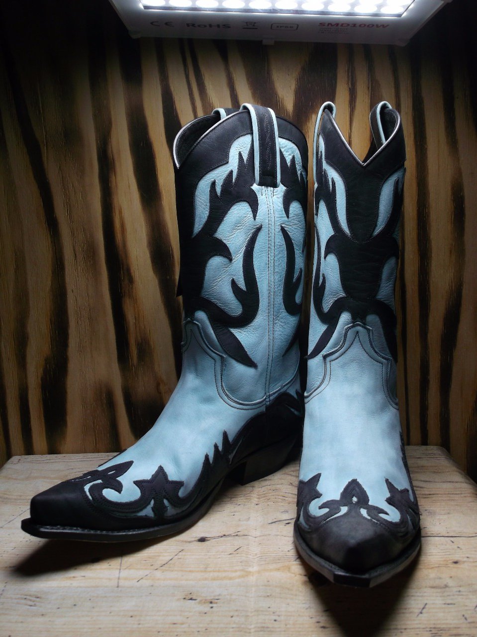 " Spinter negro lavado flota " : Bottes cuir en nubuck bleu ciel avec parement noir sur le pieds et la tige.