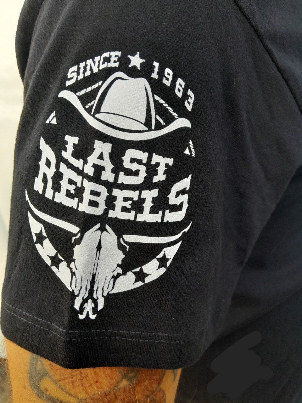 Tee-shirt de couleur noir col rond, manches courtes coupe droite avec son écrit country en gris et réal et boy en blanc, ces écrit + dessin sur les manches.