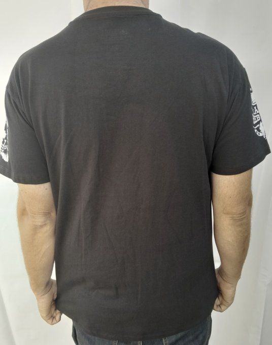 Tee-shirt de couleur noir col rond, manches courtes coupe droite son imprimée crâne en couleurs, écrit Yellowstone etc.. en blanc et jaune & ces écrit + dessin sur les manches.