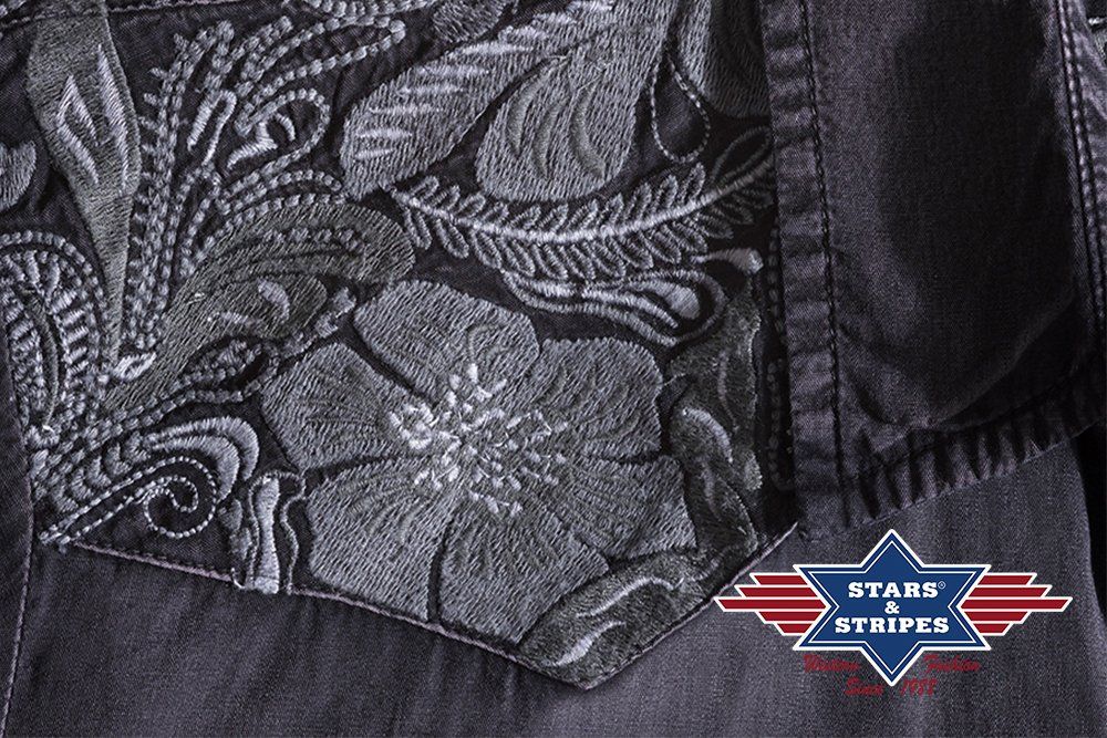 Chemise en jeans de couleur noir délavé avec broderies florale sur les plastrons, 2poches et boutons à pressions de couleur noir. Assortie à la chemise FRED (Homme).