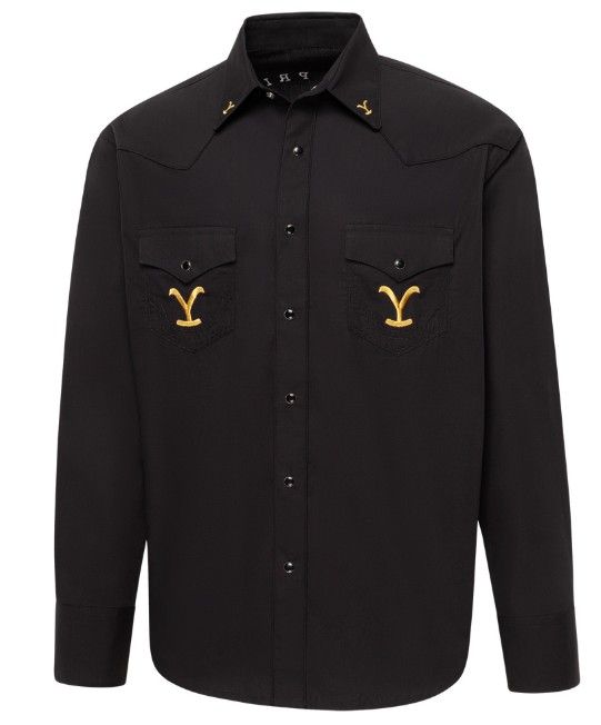 Chemise homme western classique avec le logos "Y" brodés en jaune sur le devant poches et pointe de col de chemise ainsi le dos en broderies, 2 poches, et bouton à pressions noir.